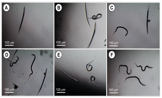 Microscopical examination of third stage larvae (L3s) of H. contortus after exposure to CS-PLGA particles loaded with combined EO components at (A) 10 µg/mL, (B) 5 µg/mL, (C) 2.5 µg/mL, and (D) 1.25 µg/mL. (E) L3s treated with 20 mg/mL levamisole were used as a positive control. (F) Untreated L3s were used as a negative control. Dead L3s in the treated and positive control samples were immobile upon prodding. Negative control larvae were actively motile even after several days of incubation. Scale bar = 100 µm.
