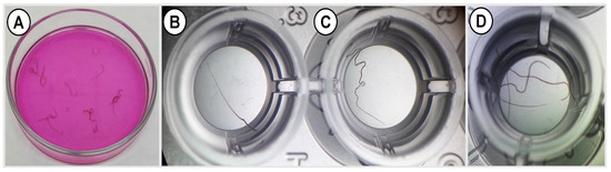 Adult worm motility assay showing worms treated with CS-PLGA particles encapsulating combined EO components. (A) H. contortus worms exposed to 10 µg/mL. 4x magnification. (B–D) T. axei worms exposed to 10, 5, and 2.5 µg/mL, respectively. 40x magnification.
