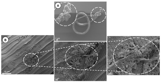 SEM micrographs of parasites treated with CS-PLGA particles loaded with combined EO components. The particles are deposited on the cuticular surface of (A) larva and (B) adult worm.