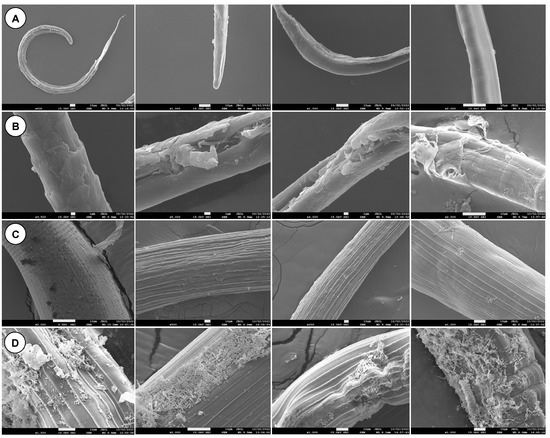 SEM micrographs of parasite stages treated with CS-PLGA particles loaded with combined EO components. (A) Negative control larvae (Scale bar = 10 µm). (B) Treated larvae (Scale bar = 1 µm). (C) Negative control adult worms (Scale bar = 10 µm). (D) Treated adult worms (Scale bar = 10 µm).