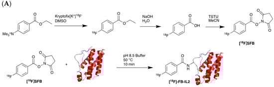 Different studies have demonstrated the clinical potential of using radiolabelled IL-2 probes for detecting activated immune cells in chronic autoimmune diseases via SPECT imaging. Gialleonardo et al. have explored PET imaging of activated T cells using [18F]-fluorobenzoyl-interleukin 2 ([18F]FB-IL-2) probe [140]. This probe uses N-succinimidyl-4-[18F]fluorobenzoate ([18F]SFB) to affect radiolabelling of the recombinant IL-2 molecule, because of the simplicity of conjugating it with the lysine side chain of a peptide/protein (Figure 7A). Gialleonardo et al. have shown that using this method, recombinant IL-2 could be labelled with good yield (c.a. RCY = 10%) and purity [140]. In addition to this, Allott et al., using click-chemistry, achieved labelling of IL-2 (Figure 7B) with E-2-(((4-[18F]fluorobenzylidene)amino)oxy)-N-(4-(6-methyl-1,2,4,5-tetrazin-3-yl)benzyl)acetamide ([18F]FBoxTz). This method allows the whole IL-2 radiolabelling process to be fully automated under GMP compatible conditions with a similar yield to the [18F]SFB method [141,142]. Additionally, [18F]FB-IL-2 was shown to specifically distinguish between unstimulated and stimulated PBMCs in various murine models [140,143,144]. Although [18F]FB-IL-2 was found to be safe in patients with metastatic melanoma receiving ICI therapy, its tumour uptake did not correlate with treatment outcome [145]. In addition, there was no correlation between IL-2R expression and baseline uptake of [18F]FB-IL-2 in four tumour tissue samples. This may be due to competitive binding with endogenous IL-2, as was suggested by the authors of the study; nevertheless, further studies are required to confirm this.