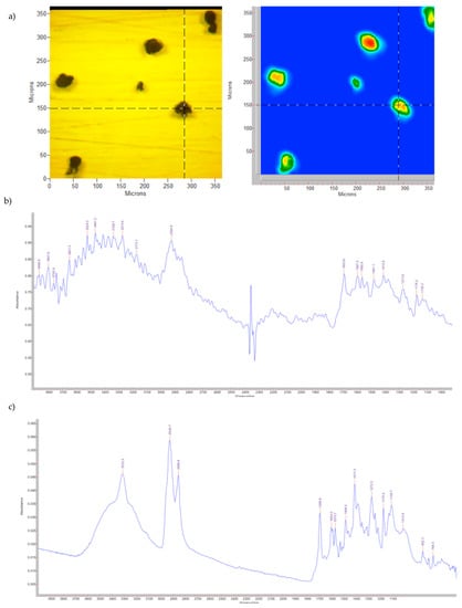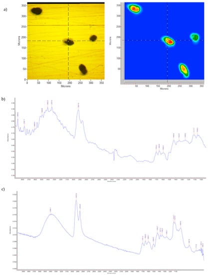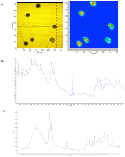 The different resolutions between the two spectra reported in Figure 1b,c are correlated by the use of different ATR crystals (Ge vs. Zn/Se) and the major sensitivity of the ATR microscope to the humidity.