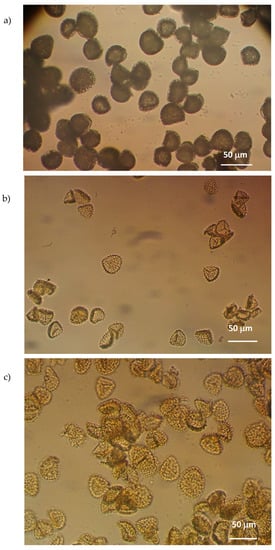 Photomicrographs of (a) untreated pollen grains, (b) SPMs and (c) ETZ-SPMs obtained by optical microscopy.