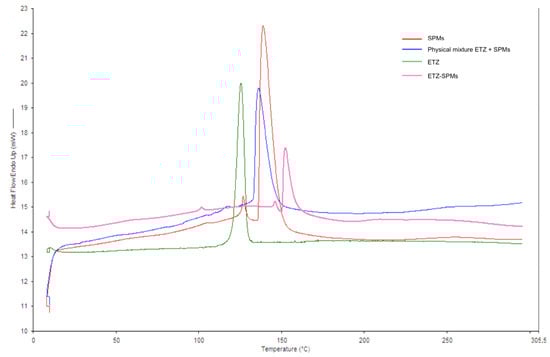 The thermograms obtained by DSC are shown in Figure 7. The melting peak at about 120 °C relative to ETZ confirms the literature data (123.27 °C) [35] and reflects its crystalline structure. It is possible to notice a shift at higher temperatures of the peak relative to the ETZ-SPMs compared to the empty SPMs. Furthermore, the melting peak of the solar filter disappears in the thermogram of ETZ-SPMs, indicative of a change from a crystalline state to a dispersed amorphous state. The physical mixture shows the peak at about 140 °C characteristic of sporopollenin microcapsules, but the spike disappears at about 120 °C and the ETZ melting peak is not detected, a sign of a surface interaction between the two products.