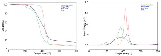 Thermograms of Lycopodium pollen grains, empty SPMs, ETZ and ETZ- SPMs (batch no. 6, Table 1) from thermogravimetric analysis are shown in Figure 8. As expected, empty SPMs show a higher thermal stability than the Lycopodium pollen grains with a starting degradation temperature (Tstart) of 265 °C and 172 °C, respectively. This is mainly due to the removal of the biological material within the pollen, which preserves the thermally stable exine and intine components. The ETZ compound shows higher thermal stability than empty SPMs, with a Tstart value of 400 °C. On the other hand, the ETZ compound itself shows higher thermal stability than empty SPMs, with a Tstart value of 400 °C and, for this reason, there is no significant effect of ETZ on the stability of the filled versus unfilled sporopollenin. In the temperature range around 400 °C, the difference in mass loss between the ETZ-loaded and empty sporopollenin is consistent with the previously determined EE% for the same batch (6.49 ± 0.28).
