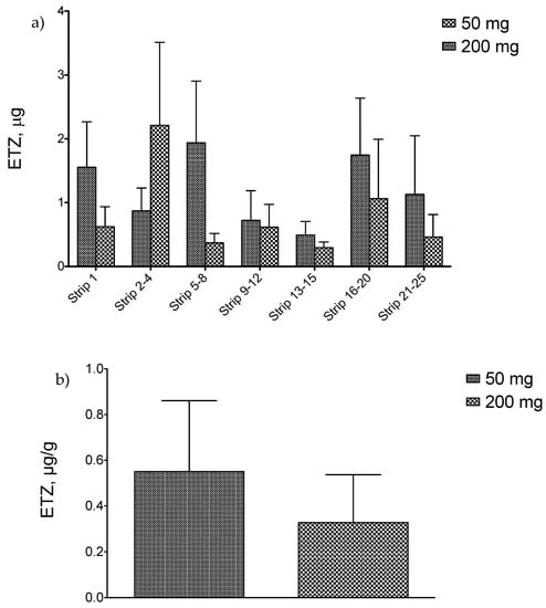 The in vitro penetration data after skin application of ETZ-SPMs in different amounts are reported in Table 5 and illustrated in Figure 9a,b for the recovery of ETZ in the tape strips (stratum corneum) and in the skin depth (epidermis and dermis), respectively. The obtained results showed that the application of either 50 or 200 mg of ETZ-SPMs produced a similar recovery of solar filter in all the skin layers, with a total amount of sun filter retained accounting for 6.195 µg and 8.782 µg, respectively.