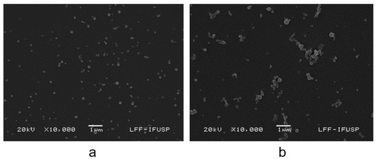 The SEM micrographs for Gr dispersions in water showed the occurrence of spherical Gr NPs (Figure 1a). For Gr/PDDA dispersions in pure water, similar spherical Gr NPs displayed an apparent aggregation (Figure 1b). This apparent aggregation of Gr NPs seen in the Gr/PDDA dispersion on Figure 1b was not confirmed by dynamic light scattering (DLS) and might have derived from drying the Gr/PDDA dispersion before depositing the gold coating for SEM visualization. The mean hydrodynamic diameter (Dz) for 0.05 mM Gr/0.05 mg/mL PDDA NPs was 240 nm.
