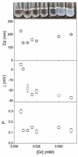 The polydispersity (P) of Gr NPs remained constant as a function of Gr concentration, revealing a good colloidal stability and an absence of aggregation between nanoparticles (Figure 2). Taking this result in combination with the increase in particle size (Dz) upon increasing Gr concentration reveals that the increase in Dz is due to the increase in the number of Gr molecules in each nanoparticle instead of interparticle aggregation.