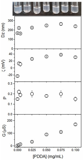 Figure 3 shows the effect of [PDDA] (0–0.1 mg/mL PDDA) at 0.05 mM Gr on Dz, P, zeta potential, and the conductance of the Gr/PDDA dispersions. In addition, the photos evidence the turbid but homogeneous features of the Gr/PDDA dispersions in pure water. In absence of PDDA, the Gr NPs exhibit a slightly negative zeta potential that was easily changed to positive values with tiny amounts of PDDA. The mean zeta potential of Gr/PDDA in the dispersions was positive; conductance increased linearly with [PDDA] (Figure 3). This showed that Gr NPs did not hamper PDDA mobility in the Gr NPs/PDDA dispersions.