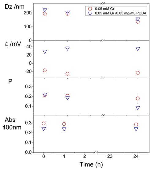 The colloid stability of Gr/PDDA dispersions was assessed from dynamic light scattering and turbidity at 400 nm measurements as a function of time over 24 h. Physical properties remained basically unchanged revealing the good colloid stability of the dispersions (Figure 4).