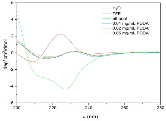 Circular dichroism spectra of 0.02 mM gramicidin (Gr) at 25 °C in different media. Aliquots (0.02 mL) of Gr stock solutions (6.4 mM) in trifluoroethanol (TFE) or ethanol were added to 2.0 mL of water, TFE, or ethanol. One should notice that in water or in aqueous PDDA solutions, Gr spherical NPs yielded the same spectrum. Alternatively, aliquots of poly (diallyldimethyl ammonium chloride) (PDDA) stock solution (10 mg/mL) were added to Gr dispersion under stirring by vortexing to yield 0.01, 0.02, and 0.05 mg/mL PDDA.