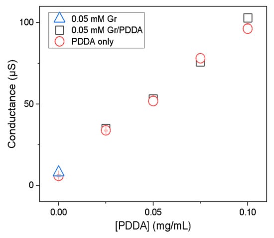 Figure 6 shows the conductance (G) of Gr NPs and Gr NPs/PDDA as a function of [PDDA] at 0.05 mM Gr in water. The dispersion of Gr NP yielded a conductance value close to that of pure water. The Gr/PDDA dispersions yielded conductance values identical to those of the corresponding PDDA solutions. The data for Gr NPs, PDDA, and Gr NPs/PDDA conductance show that PDDA and Gr NPs interact weakly. The complete immobilization of PDDA in polymeric NPs abolished PDDA conductance in the dispersion [34]. Conversely, a weak interaction of PDDA with the Gr NPs did not affect its conductance.