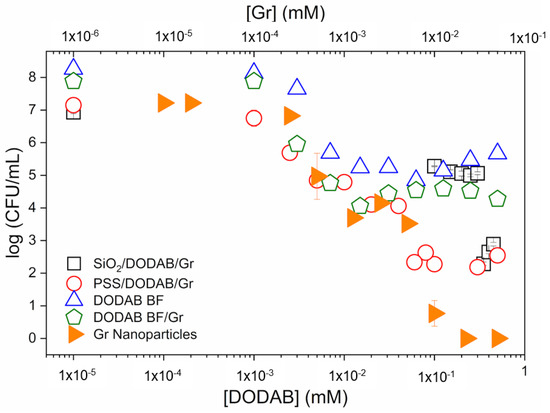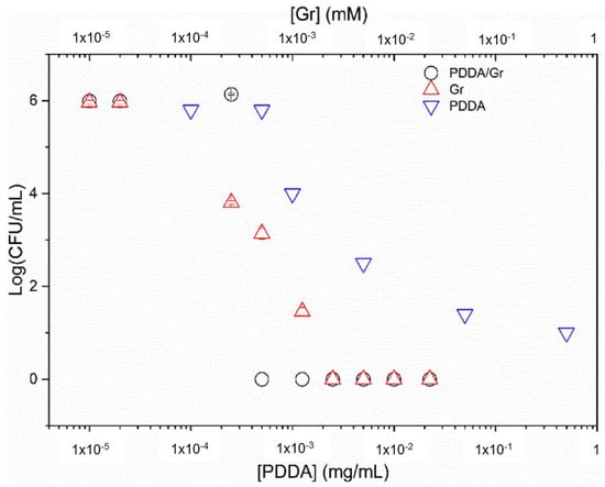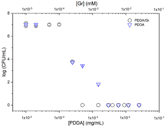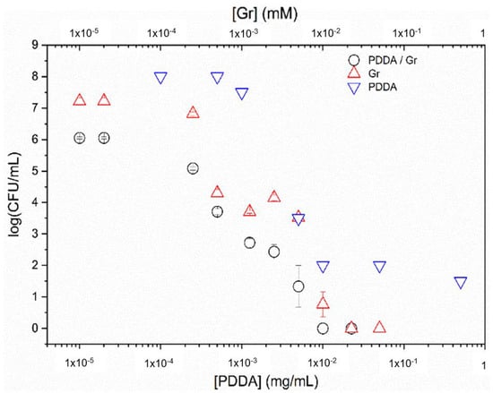 In Figure 8, the Gr NPs combined with PDDA were evaluated against S. aureus. The complete loss of cell viability for the combination occurred with the minimal microbicidal concentration (MMC) of 0.01 mM Gr/0.01 mg/mL PDDA (black hollow circles).