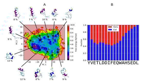 Structural landscape explored during ST simulations of C9h in aqueous solvent: (A) Free energy landscape at 300 K frames projected on principal component 1 (36% of variance) and 2 (10% of variance). Principal component analysis (PCA) applied to the 300 K frames ST simulation dataset of Caspase 9 peptide. Conformations representative of the clusters identified using k-means algorithm with k = 11 clusters (k has been chosen using the minimum silhouette score value for k values between 2 and 20) are depicted for each cluster together with the population of each cluster (%). (B) Analysis of the fraction of secondary structure adopted at each position of the peptide over all 300 K frames. Assignment of secondary structures was computed using DSSP [27].