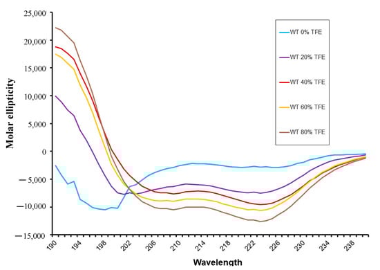 To induce α-helix formation, a titration with trifluoroethanol (TFE) (Sigma) was performed. Samples were prepared with 50 μM of peptide dissolved in a final volume of 300 μL with increasing concentrations of TFE (20%, 40%, 60%, and 80% v/v). Samples were introduced in the spectropolarimeter in a Quartz Suprasil Precision cell 0.1 cm cuvette (Hellma), using 300 μL of buffer solution as blank. Measurements were repeated 10 times at 20 °C for each sample and 5 times for each blank. Data were processed with spectropolarimeter software to subtract blank from sample spectra and millidegrees units were further converted to molar ellipticity.