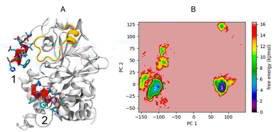 Structural landscape explored during ST simulations: (A) Central poses of clusters 1 and 2 are represented for the peptide as red cartoon and colored licorice, while the structure of PP2A is represented as white cartoon (only the structure of cluster 1 is represented for clarity), and the loop D172 to G190 is represented as an orange cartoon. (B) Free energy landscape projected on principal components 1 and 2. Principal component analysis (PCA) applied to the whole 300 K frames of ST MD simulation dataset of Caspase 9 peptide, after structural alignment on PP2A backbone atoms. Projection of first (88% of variance, y-axis) and second (6% of variance, x-axis) PCA modes computed on peptide backbone atoms. The white outline represents the contour of positions of clusters 1 and 2 frames.