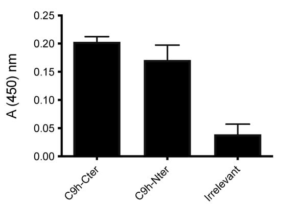Biotinylation of peptides is an efficient method to specifically bind peptides to streptavidin-coated surfaces. Nevertheless, the positioning of the biotin tag in a peptide sequence can markedly influence binding interaction. In this regard, we tested whether the biotin label should be added on the N- or C-terminus of the C9h peptide. To this end, we tested by ELISA the binding of PP2A protein to the biotinylated C9h-Nter and C9h-Cter peptides, immobilized on streptavidin-coated plate. Figure 5 shows that the biotinylated peptides C9h-Cter and C9h-Nter peptides bind to the PP2A protein in a specific manner. However, the biotinylated C9h-Cter peptide shows stronger signal recognition than that of C9h-Nter. An irrelevant biotinylated peptide was used as a negative control. According to this result, we used for further experiments the biotinylated C9h-Cter peptide.