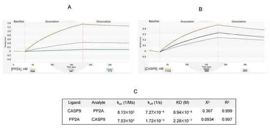 Kinetic parameters of protein/protein (Caspase 9/PP2A or vice versa) or protein/peptide (PP2A/C9h) interaction were measured by biolayer interferometry (BLI). BLI is an optical characterization method used to monitor interactions between label-free molecules in real time. It is based on the wavelength shift reflecting the change in thickness of the biological layer caused by the binding of molecules to the probe. After ensuring the absence of unspecific binding of Caspase 9 and PP2A to the protein-A biosensor, specific antibodies for Caspase 9 and PP2A were immobilized onto the probes. After a washing step, Caspase 9 and PP2A were respectively loaded onto the probes to constitute the working biosensors of interest. First, the relative PP2A interaction to the immobilized Caspase 9 molecule was studied (Figure 6A). Affinity measurements were conducted with varying concentrations of PP2A to determine the range of equilibrium binding constant values (KD = 8.94 × 10−8 M). In a vice versa procedure, PP2A was immobilized onto the probe (Figure 6B) and different concentrations of Caspase 9 protein were used to determine the constant at equilibrium (KD = 2.28 × 10−7 M). Overall, in both models, PP2A and Caspase 9 proteins were observed to bind with relatively good affinity (close to 10−7 M). Figure 6C summarize the results of constants of association, dissociation, and affinity.