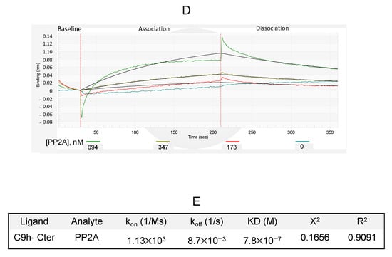 Kinetic measurements of PP2A against biotinylated C9h-Cter peptide were run by using streptavidin biosensors (Figure 6D). Different concentrations of PP2A protein were loaded onto the immobilized C9h-Cter peptide to determine the constant at equilibrium (KD = 7.8 × 10−7 M). Unspecific binding of PP2A to the sensor tip in absence of peptide was checked using PP2A at the same working concentrations. It is of note that the abrupt increase in signal looks like a bump artifact occurring when the streptavidin biosensor moves during the transition from the association to the dissociation step. In this conformation, the dissociation rate of PP2A was approximatively one log higher than those observed with the immobilized Caspase 9 protein resulting to a slightly lower affinity. Figure 6E summarize the values of constants of association, dissociation, and affinity.