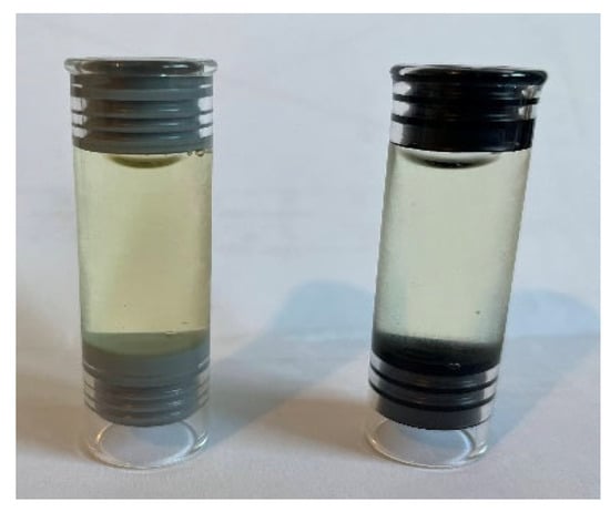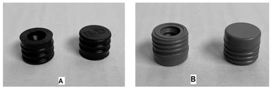 The primary packaging of the liquid formulations was a syringe glass Type I (Schott) cartridge of 3 mL capacity filled with 2 mL of the liquid formulation. Half of the syringes were sealed with the elastomeric material “PH 701/50 C BLACK” (coded as JEA, containing chlorobutyl as elastomer type and phenolic resin coating), and the other half of the syringes were sealed with the elastomer “4023/50 GRAY” (coded as JEN, made of bromobutyl material). In Figure 2, both elastomeric materials are illustrated. All syringes were stored protected from light, and placed in a horizontal position for the stability assay.