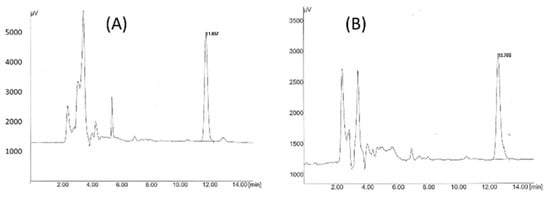 Figure 3 shows the chromatogram acquired for each benzodiazepine. Retention times for diazepam and midazolam were 11.9 and 12.7 min, respectively. Test samples of the liquid formulations were diluted with methanol (HPLC gradient grade): purified water (50:50) (v/v) to get a final theoretical concentration of 20 µg/mL and then filtered through a Millex® HV PVDF Millipore filter of 0.45 μm. The amount of benzodiazepine adsorbed on the sealing elastomeric gaskets was also quantified. The two gaskets from each syringe were soaked in a closed glass container with 20 mL of methanol (HPLC gradient grade): purified water (50:50) (v/v), mixed in a vortex, and then left for stirring for 48 h. Afterwards, the supernatant was filtered, and the benzodiazepine was quantified by HPLC by the method described above.