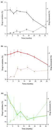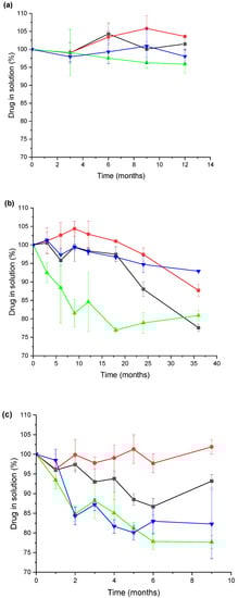 In this work, the stability of these types of formulations is defined as the time (t90) at which 90% of the initial drug concentration remained unchanged at 25 °C storage conditions, as this specification has been previously suggested by USP [32] for diazepam and midazolam solutions and in the works of Ezquer-Garin [33] and Mékidèche [34]. According to the t90 criteria as the definition of expired date, it is denoted as the limit of drug stability of the studied formulations. The stability data shown in Figure 5 shows that the midazolam formulation with sealing type PH 701/50 C BLACK (coded as MJEA) is not suitable. Moreover, the interaction between midazolam and the sealing type 4023/50 GRAY leads to a colour change, making this formulation, coded as MJEN, not suitable either.