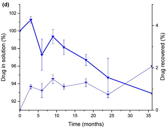 Figure 5 shows the evolution of benzodiazepine’s recovery under different storage conditions based on the different types of elastomer gasket used. The temperature had a significant and direct effect on the loss of both benzodiazepines (p-value < 0.01, ANOVA). In our experimental conditions, diazepam formulations were significantly (p-value < 0.001, Student’s t-test) more stable than midazolam formulations. The effect of temperature and storage time on the degradation of diazepam was also described by Smith et al. [27]. Diazepam and midazolam were stable (>90% drug content) at 4 °C over 12 months. However, drug loss was significantly higher at 25 °C when the JEA elastomeric gaskets were utilised. This was more noticeable with midazolam, whose drug content went well below 90% after 3 months of storage in the presence of JEA gaskets. At 40 °C, drug degradation was more pronounced. However, no significant differences were observed between JEA and JEN for the midazolam. This can be related to a deep alteration in the integrity of the elastomeric gaskets at this temperature, resulting in similar drug adsorption. In fact, drug loss in the solution is probably due to the combined effect of drug sorption on the elastomeric material and chemical drug degradation in the solution.