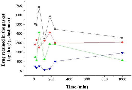 Figure 7 shows the adsorption process of diazepam and midazolam on the two different elastomeric materials tested, GRAY JEN and BLACK JEA. Diazepam showed about 2-fold greater adsorption (p-value > 0.05) on the BLACK gaskets compared to midazolam. Further, both benzodiazepines showed significantly higher adsorption at earlier times on BLACK JEA gaskets (509 and 200 µg of diazepam and midazolam, respectively, per gram of elastomer) compared to GRAY JEN materials (299 and 36 µg of diazepam and midazolam, respectively, per gram of elastomer). This is the first report that provides evidence about the use of novel JEN elastomeric materials as a better choice than conventional BLACK JEA gaskets when formulating autoinjectors loaded with benzodiazepines. Other authors have reported an enhanced apparent degradation rate of interferon in contact with cholobutyl stoppers compared to I borosilicate ampoules, which, in our opinion, can be related to a poor drug recovery from the elastomeric stopper rather than chemical degradation in the solution [28].