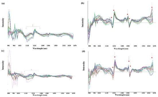 NIR accumulated spectra after data normalisation and a second derivative in the adsorption study for both drugs and two elastomeric materials. Key: (a) DJEA; (b) DJEN; (c) MJEA; and (d) MJEN.