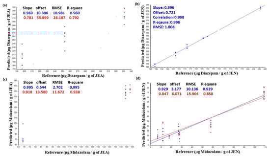Multivariate data analysis was performed using Unscrambler® X software (CAMO Software, Oslo, Norway) [23]. Pre-processing transformation (data normalisation) was used, followed by the second derivative Savitzky-Golay (7 points). Partial Least Squares Regression (PLSR) was used to create calibration models for quantitative analysis of both benzodiazepines on the surface of the elastomeric material. Each spectroscopic signal was correlated with the total content of benzodiazepine adsorbed on the gaskets. The Kernel and NIPALS algorithms were used to compute the estimated regression coefficients for PLSR. The performance of the models was evaluated using the correlation coefficient (R2), and the root mean square error (RMSE) to estimate the fit of validation and calibration samples [24]. The full spectra were included in the PLSR for the JEN gaskets, while in the JEA gaskets, only the range within 1120–1250 cm−1 was included in the model. In the JEA gaskets, the data points at 15, 30, and 60 min were removed from the chemometric model due to the resin release to the media at earlier time points.