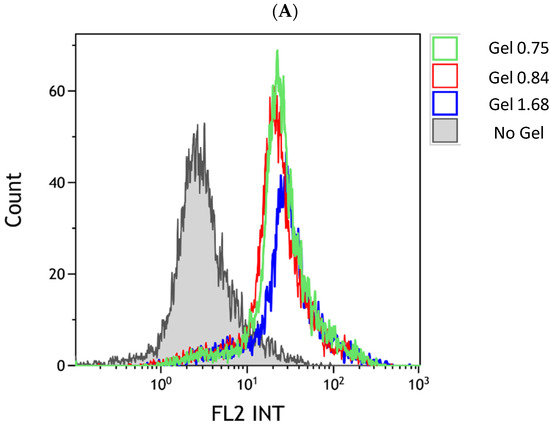 Release data showed that manipulation of the ELP–collagen ratio affects the rate of drug release, in a pH-dependent fashion. We next used flow cytometry to determine if the Dox released into the media would be taken up into cancer cells in vitro. The U-87 MG glioma cells were incubated with ELP–DOXO hydrogels for four hours then stripped from the cell culture plate non-enzymatically. Cellular fluorescence from Dox uptake was measured by flow cytometer, controlling for any auto-fluorescence, as shown in Figure 4. Comparatively, cells treated with hydrogels made with the lowest collagen concentration showed higher levels of uptake, and this corresponds to the release data shown in Figure 3, demonstrating faster release of Dox from compositions with more ELP per collagen.