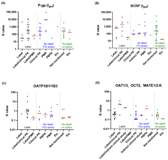 The following supporting information can be downloaded at: https://www.mdpi.com/article/10.3390/pharmaceutics14102078/s1, Table S1. List of drugs involved in the analysis of this study; Table S2. R values calculated by basic method; Table S3. Follow-up actions for in vitro transporter inhibitor drugs or rationales for no labeling; Table S4. Follow-up actions for in vitro transporter substrate drugs or rationales for no labeling.