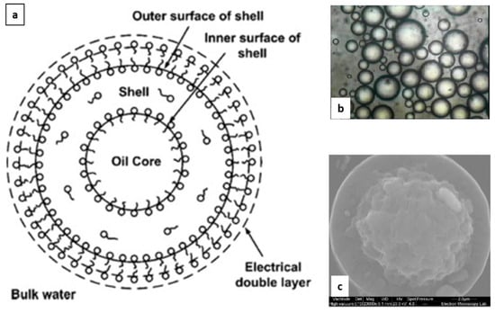 An aphron consists of a core of apolar solvent encapsulated in an outer shell with a multilayer structure of oil, water, or water-soluble surfactant which stabilizes the core in the continuous phase (panel (a)). The multimolecular layer forms a robust shell around oil droplets, improving the colloidal stability of aphrons (panel (b), adapted from []). The size of the polyaphron droplet is comprised in the micron range. The cryo-SE microphotograph of a fractured aphron shows also the presence of a central, rough region surrounded by a smooth outer shell (panel (c), adapted from []).