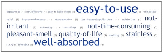 Word cloud representing keywords linked to the patient preference to topical formulations. The difference in character dimension is related to the frequency in Ref. [].