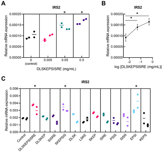 Enhanced Irs2 messenger RNA (mRNA) transcription in primary murine fibroblasts after incubation with DLSKEPSISRE and its pharmacophores SKEPSIS and EPSI. (A,B) DLSKEPSISRE dose-dependently increased Irs2 mRNA levels in cell culture, with a significant effect at 0.05 and 0.5 mg/mL (F(3, 4) = 11.98, p = 0.018). (C) SKEPSIS and EPSI pharmacophores (0.05 mg/mL) increased Irs2 mRNA levels in a similar manner to DLSKEPSISRE (F(12, 13) = 3.276, p = 0.022). The results are presented as individual values (dots) and the median (dash) of two biological and two technical replicates. * p < 0.05 versus the control group; nested one-way analysis of variance, discovery by two-stage linear step-up procedure of Benjamini, Krieger, and Yekutieli, at a Q threshold of 0.05.