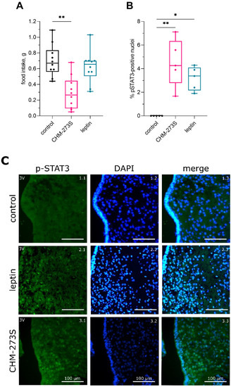 In a separate study, we analyzed p-STAT3 in the hypothalamus of naïve C57BL/6 mice 60 min after i.n. CHM-273S (10 mg/kg), i.p. leptin (5 mg/kg), or i.p. saline (control group) treatment. We found STAT3-positive nuclei in the hypothalamus of mice treated with CHM-273S or leptin, and no expression of p-STAT3 in the control group (Figure 2B,C). We found p-STAT3-immunoreactive nuclei in 4% of cells after treatment with CHM-273S and in 3% of cells after leptin injection (Figure 2B).