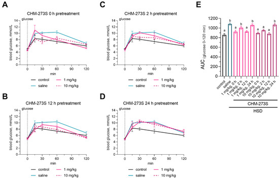 The effects of CHM-273S pretreatment on the oral glucose tolerance test (OGTT) in rats after they had consumed the high-sucrose diet (HSD) for 5 weeks. Blood glucose concentrations were measured by a glucometer after a 12 h fast at 0, 15, 30, 60, and 120 min following gavage with 2 g/kg of an oral glucose (40%) preload (A) 0 h, (B) 2 h, (C) 12 h, or (D) 24 h after intraperitoneal (i.p.) CHM-273S (1 or 10 mg/kg) treatment (n = 5 each group). (E) Area under the curve (AUC) for the OGTT in HSD-fed rats after CHM-273S administration. Blood glucose levels were significantly higher in the HSD-fed, saline-treated group (n = 5) and in HSD-fed, CHM-273S-treated rats (1 mg/kg 2 or 24 h or 10 mg/kg 24 h before OGTT, n = 5 each) (F(9,40) = 9.46, p < 0.0001). There was a significant reduction in blood glucose compared with the HSD-fed, saline-treated rats (n = 5) in groups pretreated with 1 mg/kg (0 or 12 h before OGTT, n = 5 each) or 10 mg/kg CHM-273S (0, 2, or 12 h before OGTT, n = 5 each) (F(9,40) = 9.46, p < 0.0001). The results are presented as the mean ± standard error of the mean. Different superscript letters indicate significant differences at p < 0.05.; one-way analysis of variance with the Holm–Šídák multiple comparisons test.