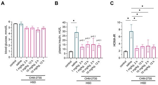 Fasting blood glucose, insulin, and homeostatic model assessment for insulin resistance (HOMA-IR) in high-sucrose diet (HSD)-fed rats pretreated with CHM-273S 2 or 12 h before blood collection. (A) Blood glucose levels in HSD-fed, saline-treated (n = 4) and HSD-fed, CHM-273S-treated (n = 4 each) rats did not differ from the control values (n = 4) after a 12 h fast (F(5,18) = 2.17, p = 0.10). (B) Plasma insulin was significantly higher in HSD-fed, saline-treated rats (n = 4) compared with the control group (n = 4). Administration of 1 or 10 mg/kg CHM-273 intraperitoneally (i.p.) 2 or 12 h before blood collection (n = 4 each) showed a trend (p < 0.1) for reduced insulin levels compared with the HSD-fed, saline-treated group (F(5,18) = 2.67, p = 0.05). (C) The HOMA-IR index was restored to the control values in HSD-fed rats when treated with 1 or 10 mg/kg CHM-273 i.p. 2 or 12 h before blood collection (n = 4 each; F(5,18) = 2.94, p = 0.04). The results are presented as the mean ± standard error of the mean. * p < 0.05 versus the HSD-fed, saline-treated group; one-way analysis of variance with the Holm–Šídák multiple comparisons test.