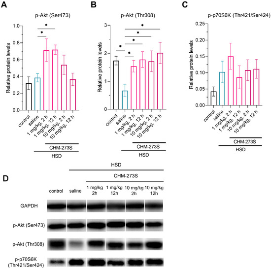 Western blot analysis of p-Akt (Ser473), p-Akt (Thr308), and p-p70S6K (Thr421/Ser424) proteins in the liver of high-sucrose diet (HSD)-fed, CHM-273-treated rats (2 or 12 h prior to sample collection), normalized to GAPDH. Three minutes before the liver sample collection, the animals received intravenous insulin infusion (10 U/kg). (A) p-Akt (Ser473) levels were not affected by the HSD, but treatment with CHM-273S (1 mg/kg intraperitoneal, i.p.) 2 or 12 h before sample collection (n = 4–5) increased its expression in hepatocytes compared with the HSD-fed, saline-treated group (n = 5; F(5,21) = 4.43, p = 0.006). (B) p-Akt (Thr308) was significantly reduced in HSD-fed, saline-treated rats, while CHM-273S given 2 or 12 h prior to collection at 1 or 10 mg/kg (n = 4–5) restored its levels to the control values (n = 4; F(5,21) = 2.96, p = 0.04). (C) p-p70S6K (Thr421/Ser424) levels did not differ among the treatment groups (F(5,21) = 1.09, p = 0.32). The results are presented as the mean ± standard error of the mean. * p < 0.05 versus the saline-treated group; one-way analysis of variance with the Holm–Šídák multiple comparisons test. (D) Representative Western blot bands for each group are shown; GAPDH serves as a loading control.