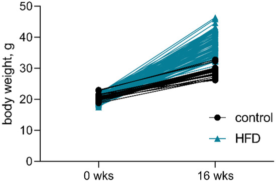 Body weight of mice fed standard chow (control, n = 25) or the high-fat diet (HFD, n = 100) at the beginning of the experiment (0 weeks (wks)) and after 16 wks. The approximate energy was 516 kcal/100 g (45% fat, 35% carbohydrates, and 20% protein) for the HFD feed and 306 kcal/100 g (9% fat, 58% carbohydrates, and 33% protein) for the standard chow.