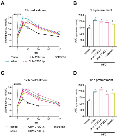 The effects of CHM-273S (5 mg/kg intraperitoneally (i.p.) or intranasally (i.n.), n = 12–13 each) and metformin (250 mg/kg perorally (p.o.), n = 12–13) pretreatment after 16 weeks of the high-fat diet (HFD) on the oral glucose tolerance test (OGTT) in mice. Blood glucose concentrations were measured by a glucometer after a 12 h fast at 0, 15, 30, 60, and 120 min following gavage with 2 g/kg of an oral glucose (40%) preload (A) 2 h or (C) 12 h after CHM-273S or metformin treatment. (B,D) The area under the curve (AUC) for the OGTT in HFD-fed mice after CHM-273S or metformin pretreatment for 2 or 12 h. Compared with the control group, the blood glucose levels were significantly higher in the HFD-fed, saline-treated; HFD-fed, metformin-treated; and HFD-fed, CHM-273S-treated groups when the treatment was administered (B) 2 h (F(4,60) = 19.54, p < 0.0001) or (D) 12 h (F(4,60) = 34.23, p < 0.0001) before the OGTT. There was a significant reduction in blood glucose compared with HFD-fed, saline-treated mice in groups pretreated with i.n. CHM-273S or metformin 2 h before the OGTT (F(4,60) = 19.54, p < 0.0001). The results are presented as the mean ± standard error of the mean. Different superscript letters indicate significant differences at p < 0.05.; one-way analysis of variance with the Holm–Šídák multiple comparisons test.