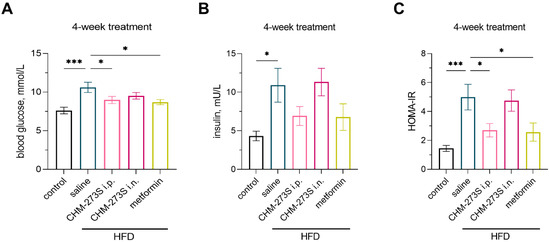 Analysis of blood glucose and insulin revealed significantly higher levels of both analytes in HFD-fed mice (Figure 8A,B). Hyperglycemia induced by HFD was abolished by chronic i.p. CHM-273S or metformin; there were no treatment-related effects on insulin concentrations (Figure 8A,B). HOMA-IR was also reduced to control values in HFD-fed groups treated with i.p. CHM-273S or metformin (Figure 8C).