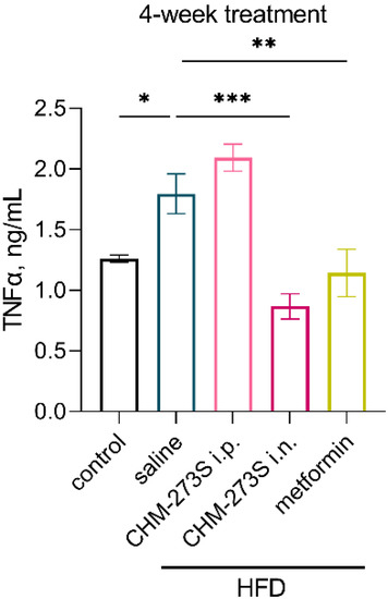 The results of tumor necrosis alpha (TNFα) immunoassay in mouse serum. The increased circulating TNFα level in the serum of high-fat diet (HFD)-fed mice was abolished by 4-week treatment with CHM-273S (5 mg/kg intranasally, n = 10) or metformin (250 mg/kg perorally, n = 10) (F(4,45) = 12.44, p < 0.0001). The results are presented as the mean ± standard error of the mean. * p < 0.05, ** p < 0.01, *** p < 0.001, versus the HFD-fed, saline-treated group; one-way analysis of variance with the Holm–Šídák multiple comparisons test.
