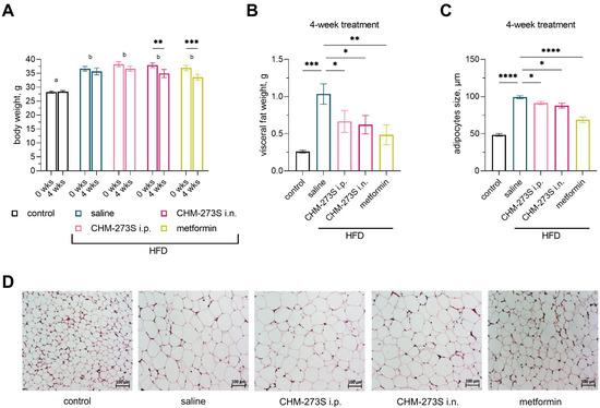 Body weight, visceral fat pad weight, and histological analysis of visceral adipocytes of mice fed the high-fat diet (HFD) after 4 weeks of treatment with CHM-273S (5 mg/kg, intraperitoneally (i.p.) or intranasally (i.n.), n = 10 each) or metformin (250 mg/kg perorally (p.o.), n = 10). (A) Body weight showed significant treatment (F(4,45) = 18.4, p < 0.0001) and time (F(1,45) = 23.31, p < 0.0001) main effects and a significant treatment × time interaction (F(4,45) = 3.21, p = 0.02). HFD-fed mice had excess weight compared with control animals fed a standard diet. The body weight of animals that received i.p. CHM-273S or metformin significantly decreased after 4-week treatment. (B) Excess visceral fat surrounding the testes and (C) the enlargement of adipocytes in HFD-fed mice was less pronounced when animals were treated with either CHM-273S (i.n. or i.p.) or metformin (F(4,45) = 5.7, p = 0.0009 and F(4,45) = 57.7, p < 0.0001, respectively). The results are presented as the mean ± standard error of the mean. Different superscript letters indicate significant differences at p < 0.05. * p < 0.05, ** p < 0.01, *** p < 0.001, **** p < 0.0001 versus the HFD-fed, saline-treated group; repeated measures analysis of variance (ANOVA) (body weight) or one-way ANOVA (visceral fat pad weight and adipocyte size) with the Holm–Šídák multiple comparisons test. (D) Representative histological images of visceral adipocytes.