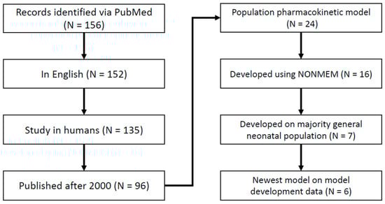 A literature review was conducted to identify population pharmacokinetic models describing gentamicin PK in neonates for clinical use (Figure 1). Models were included in this analysis if they were: (1) developed on a population closely aligned with the data set described here [9], i.e., majority neonatal population; (2) developed on a non-specialized population (i.e., not hypothermic or septic); (3) used routinely collected covariates; (4) developed in NONMEM; (5) not superseded by a newer model fit; and (6) developed after the year 2000. The last criteria derives from our experience in implementing and evaluating over 200 popPK models from the literature, from the estimation methods being more approximate before 2000 [20], and from the lack of modern consensus on what constitutes proper model development and diagnostics in models developed before 2000 [21,22,23].
