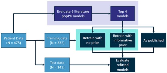 Diagram depicting the experimental design of this study. Six population pharmacokinetic models from the literature were evaluated (purple box). The three models with lowest error and bias were retrained with and without priors (teal box) and evaluated on a held-out test data set.