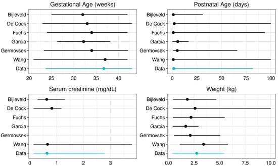Model development population covariate distributions. Dots (lines) represent median (range), except for Garcia covariates, which are given as mean (two times standard deviation). Postnatal age is cropped to 100 days and weight cropped to 10 kg for clarity.