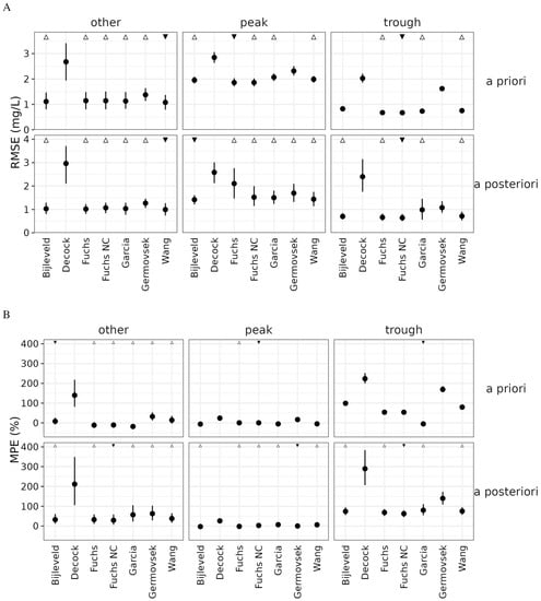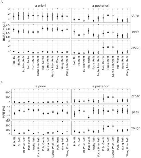 (A) Root mean square error (RMSE) and (B) mean percent error (MPE) on testing data for published models (circles), fully refit models (filled squares), and models refit with $PRIOR in NONMEM (hollow squares). Closed circles (vertical bars) represent the median (5th to 95th percentile) of 1000 bootstraps. Statistical significance was determined by presence of overlapping confidence intervals: ▼ represents the model with lowest median RMSE or lowest absolute median MPE in that category; △ represents models not statistically different from the best model. BL: Bijleveld.