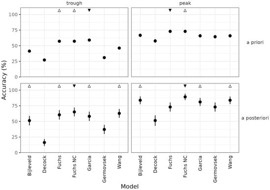 Accuracy of published gentamicin models in predicting target attainment for troughs and peaks, stratified by population (“a priori”) or individualized (“a posteriori”) predictions. Trough predictions are accurate if the prediction is within 0.5 mg/L of the actual value. Peak predictions are accurate if the prediction is within 2 mg/L of the actual value. Statistical significance was determined by presence of overlapping confidence intervals: ▼ represents the model with highest median accuracy in that category; △ represents models not statistically different from the best model. Fuchs NC: Fuchs no covariance.