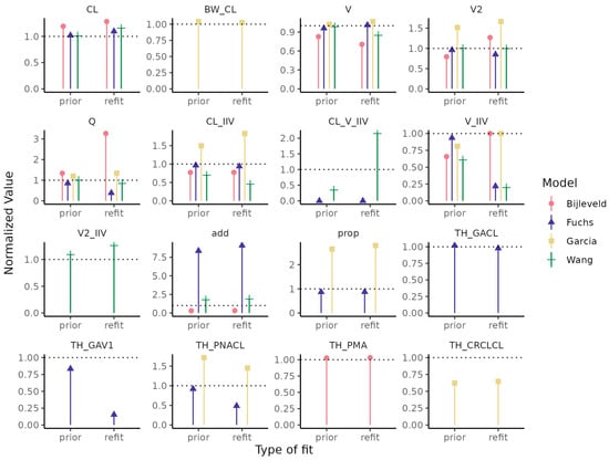 Parameter estimates, normalized to the published value, for the refit with informative prior (“prior”) and refit without prior (“refit”) versions of each of the Wang, Bijleveld, Fuchs, and Garcia popPK models. CL: Clearance; BW_CL: effect of body weight on CL; V: volume of distribution of central compartment; V2: volume of distribution of peripheral compartment; Q: intercompartmental clearance; IIV: interindividual variability; add: additive error; prop: proportional error; TH_PMA: effect of PMA on CL; TH_GACL: effect of GA on CL; TH_GAV1: effect of GA on V1; TH_PNACL: effect of PNA on CL, TH_CRCLCL: effect of creatinine clearance (CRCL) on CL.